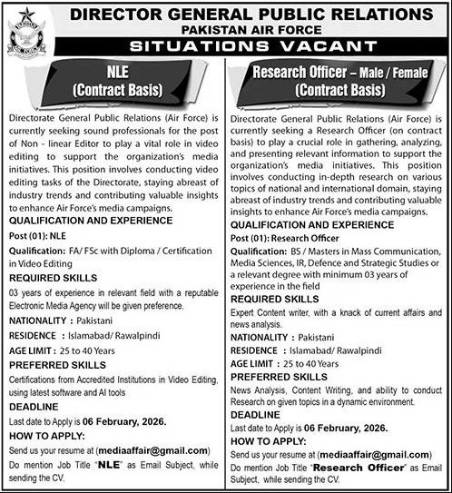 Both male and female candidates can apply for this General Public Relations Jobs Qualification /Experience Required: Qualification: BS/Masters in Mass Communication, Media Sciences, IR, Defence and Strategic Studies or a relevant degree with minimum 03 years of experience in the field REQUIRED SKILLS Expert Content writer, with a knack of current affairs and news analysis, and more experienced candidates should apply before 06 February 2026.
