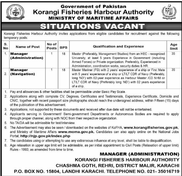 Candidates, if you are seeking the Korangi Fisheries Harbour Authority Karachi Jobs 2026, Apply Online if yes. It would be best if you tried to complete reading this Korangi Fisheries Harbour Authority Karachi Jobs because you can easily apply for this vacancy as a Manager Administration anda Manager Navigation.