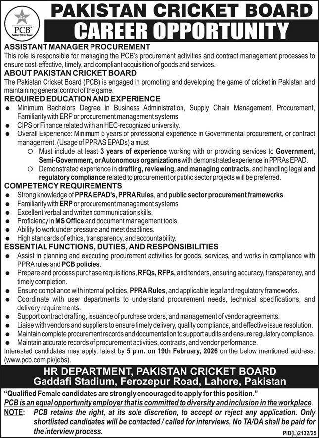 Only male candidates can apply for this Cricket Board Jobs Qualification /Experience Required: Minimum Bachelor’s Degree in Business Administration, Supply Chain Management, Procurement, Familiarity with ERP or procurement management systems, CIPS, or Finance related to an HEC-recognized university. Overall Experience: Minimum 5 years of professional experience in Governmental procurement or contract management. (Usage of PPRAS EPADS) a must O Must include at least 3 years of experience working with or providing services to Government, Semi-Government, or Autonomous organizations with demonstrated experience in PPRAS EPAD. O Demonstrated experience in drafting, reviewing, and managing contracts, and handling legal and regulatory compliance related to procurement or public sector projects will be preferred, and more experienced candidates should apply before 19 February 2026.