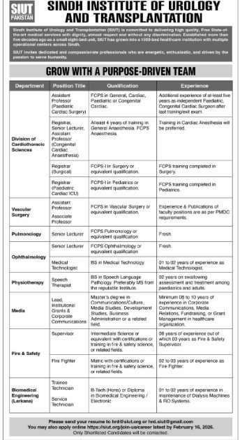 Only male candidates can apply for these Sindh Institute of Urology Jobs. Qualification /Experience Required: Intermediate Science or equivalent with certifications or training in fire & safety science, or related fields. Matic with certifications or training in fre & safery science, or related fields. B-Tech (Hons) or Diploma in Biomedical Engineering/Electronics, and more experienced candidates should apply before 16 February 2026.