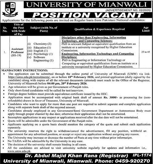 Only male candidates can apply for the University of Mianwali Jobs. Qualification /Experience Required: PhD in a relevant Subject or equivalent qualification from an institute or a university recognized by the Higher Education Commission. Engineering, Information Technology, and Computing Disciplines: PhD in Engineering, Information Technology, or Computing, or equivalent qualification from an institute or a university recognized by the Higher Education Commission, and more experienced candidates should apply before 18 February 2026.